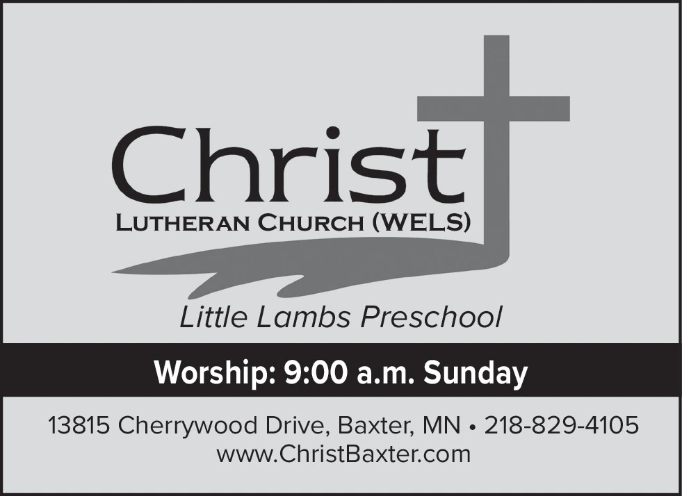 Christ LUTHERAN CHURCH (WELS) Little Lambs Preschool Worship: 9:00 a.m. Sunday 13815 Cherrywood Drive, Baxter, MN 218-829-4105 www.ChristBaxter.com Christ LUTHERAN CHURCH ( WELS ) Little Lambs Preschool Worship : 9:00 a.m. Sunday 13815 Cherrywood Drive , Baxter , MN 218-829-4105 www.ChristBaxter.com