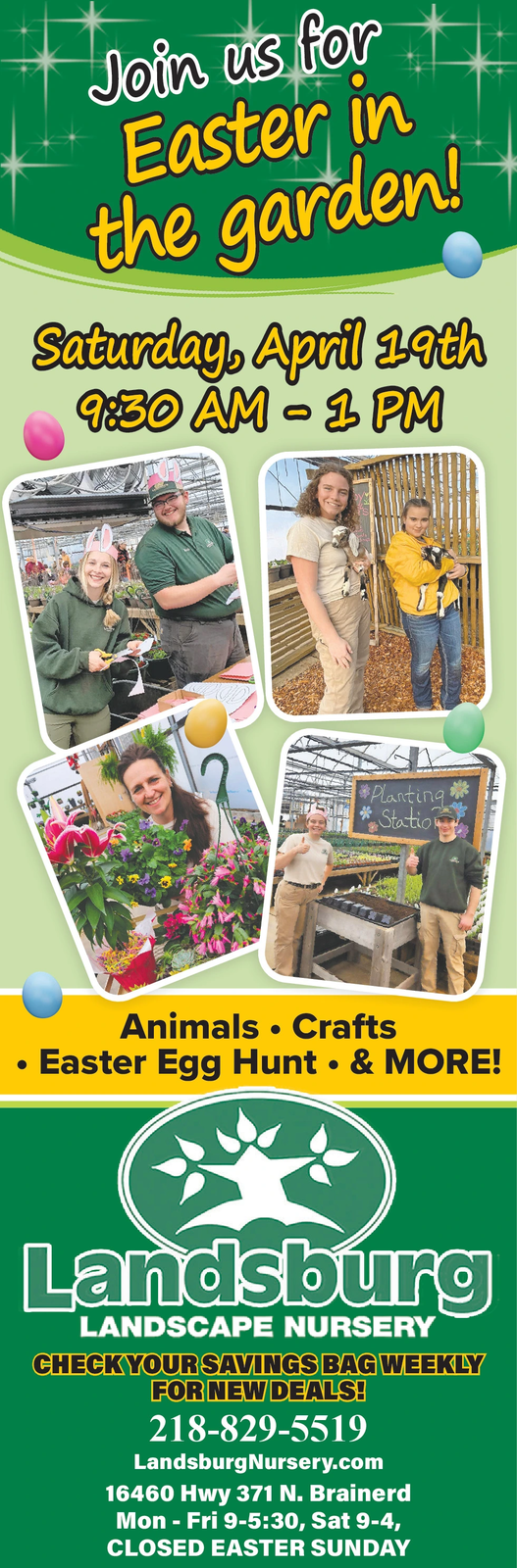 Join us for Easter in the garden! Saturday, April 19th 9:30 AM-1 PM Planting Station . Animals Crafts . Easter Egg Hunt & MORE! Landsburg LANDSCAPE NURSERY CHECK YOUR SAVINGS BAG WEEKLY FOR NEW DEALS! 218-829-5519 Landsburg Nursery.com 16460 Hwy 371 N. Brainerd Mon - Fri 9-5:30, Sat 9-4, CLOSED EASTER SUNDAY Join us for Easter in the garden ! Saturday , April 19th 9:30 AM - 1 PM Planting Station . Animals Crafts . Easter Egg Hunt & MORE ! Landsburg LANDSCAPE NURSERY CHECK YOUR SAVINGS BAG WEEKLY FOR NEW DEALS ! 218-829-5519 Landsburg Nursery.com 16460 Hwy 371 N. Brainerd Mon - Fri 9-5 : 30 , Sat 9-4 , CLOSED EASTER SUNDAY
