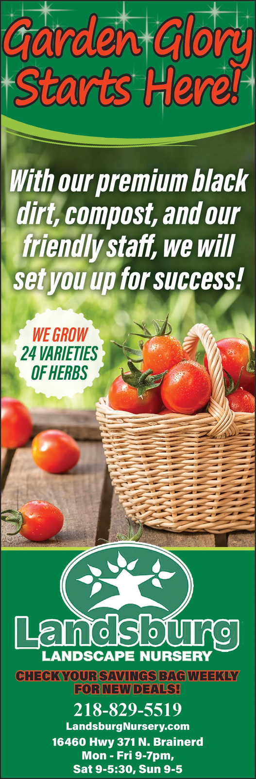 Garden Glory Starts Here! With our premium black dirt, compost, and our friendly staff, we will set you up for success! WE GROW 24 VARIETIES OF HERBS Landsburg LANDSCAPE NURSERY CHECK YOUR SAVINGS BAG WEEKLY FOR NEW DEALS! 218-829-5519 LandsburgNursery.com 16460 Hwy 371 N. Brainerd Mon - Fri 9-7pm, Sat 9-5:30, Sun 9-5 Garden Glory Starts Here ! With our premium black dirt , compost , and our friendly staff , we will set you up for success ! WE GROW 24 VARIETIES OF HERBS Landsburg LANDSCAPE NURSERY CHECK YOUR SAVINGS BAG WEEKLY FOR NEW DEALS ! 218-829-5519 LandsburgNursery.com 16460 Hwy 371 N. Brainerd Mon - Fri 9-7pm , Sat 9-5 : 30 , Sun 9-5
